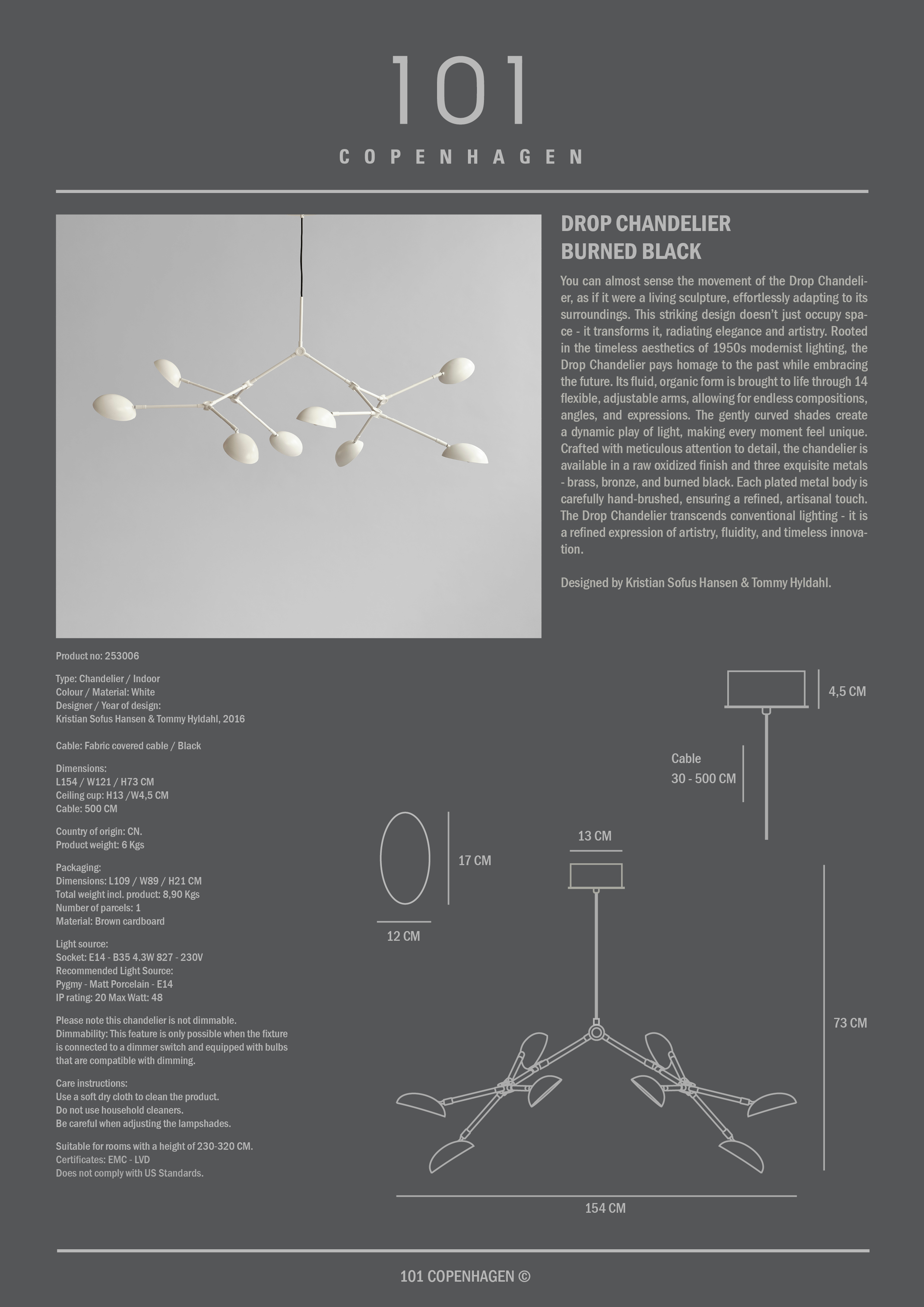 Drop-kattokruunu on kuin elävä veistos, joka mukautuu ympäristöönsä ja luo elegantin ja taiteellisen ilmeen. 1950-luvun modernistisesta valaistuksesta inspiraationsa saanut valaisin yhdistää menneisyyden ja nykyisyyden orgaanisella muotoilulla, jossa on 14 joustavaa vartta, joita voidaan säätää lukemattomiin suuntiin. Kaarevat varjostimet tarjoavat eloisan valon, joka muuttaa huoneen tunnelmaa. Valaisin on saatavana raakahapettuneena sekä messingistä, pronssista, poltetusta mustasta ja valkoisesta, kaikki käsinharjattuina hienostuneen ilmeen saavuttamiseksi. Drop-kattokruunu on enemmän kuin lamppu, se on ajatonta innovaatiota ja taiteellista muotoilua. Sen ovat suunnitelleet Kristian Sofus Hansen ja Tommy Hyldahl.