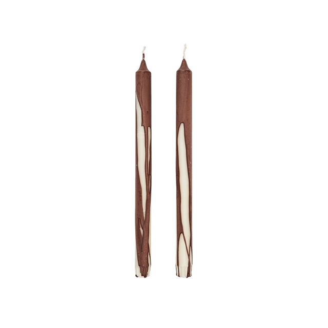 Ferm Living Drip-kynttilät ovat enemmän kuin vain kynttilöitä. Ne toimivat pieninä koriste-esineinä huoneessa. Jokainen kynttilä on valmistettu puhtaasta kynttilävahasta, ja niille on ominaista käsin tipputettu pinta, jossa syvä, tumma väri valuu vaalean pohjan päälle. Tämä luo eloisan värien ja tekstuurien leikin, joka antaa kynttilöille lähes veistoksellisen ilmeen. Paloaika noin 9 tuntia.