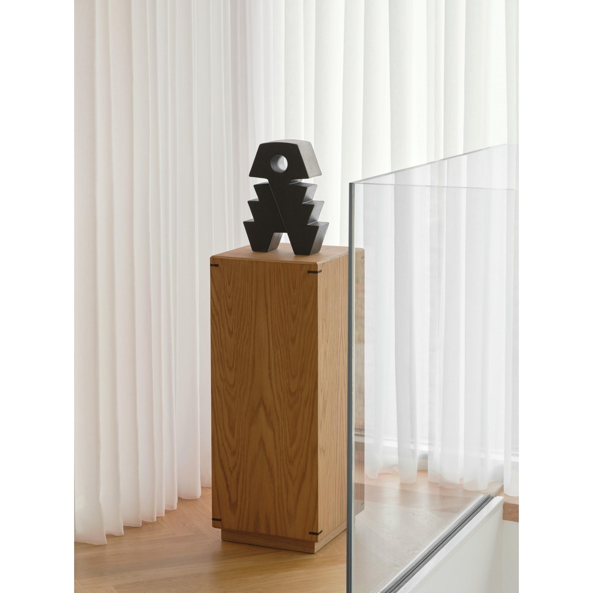Syvänmusta pinta lisää visuaalista painoa ja antaa esineelle vahvan läsnäolon tilassa. Samalla kompaktin muotoilun rikkoo pyöreä aukko päässä, joka luo tarkoituksellisen tyhjyyden ja lisää ilmeeseen syvyyttä.